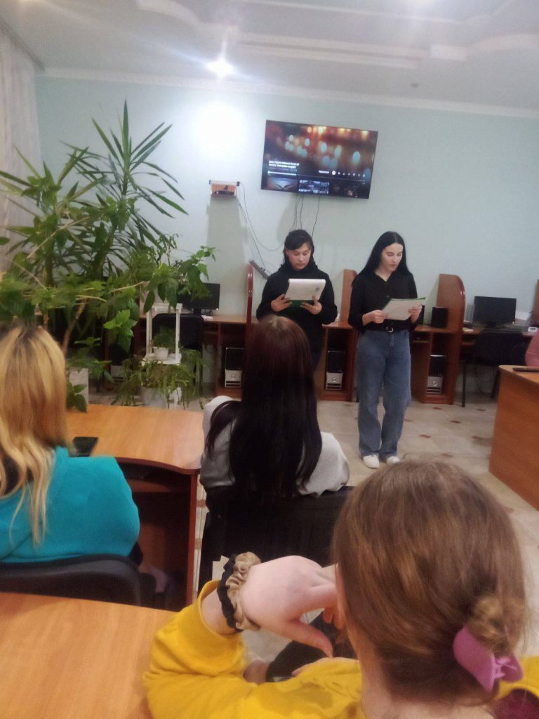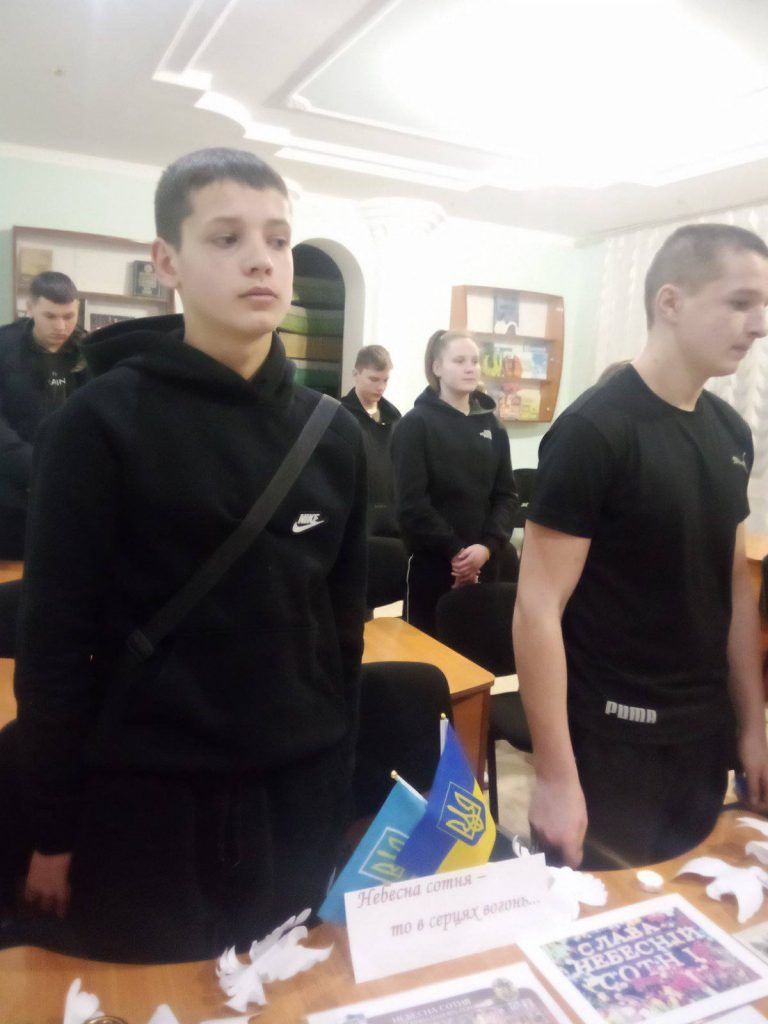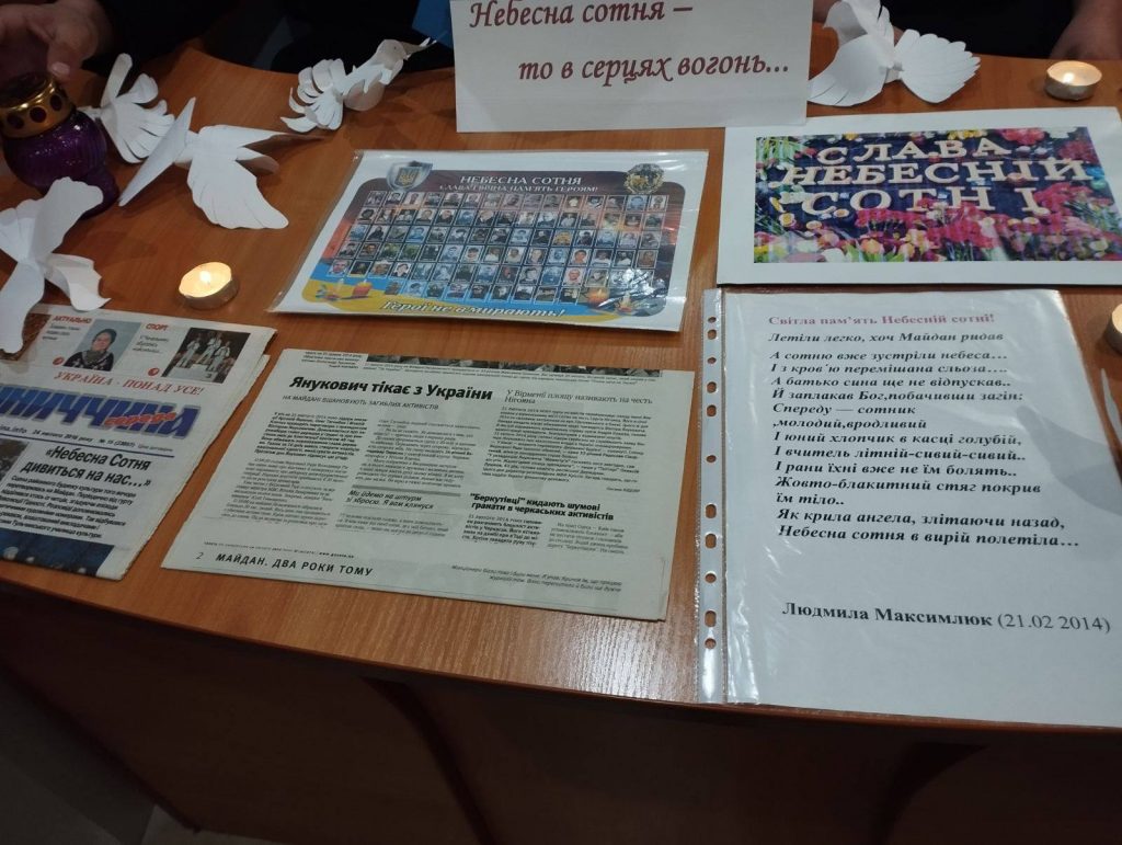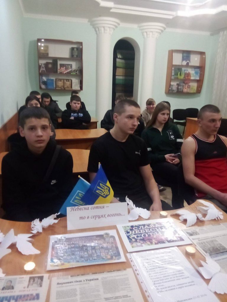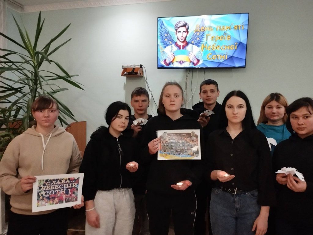 Для увічнення пам’яті полеглих учасників Революції Гідності в читальному залі вихователями Галиною Лисак та Світланою Лагич була проведена тематична виховна година: “Небесна Сотня: Герої не вмирають”.Присутні в знак скорботи хвилиною мовчання вшанували пам’ять Героїв Небесної Сотні. Учні прослухали пісню-реквієм “Плине кача” та переглянули фільм “Ангели майдану”.